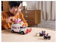 - The play food truck features a six-stud rapid shooter, a spiked front fender and opening sides for easy access to the kitchen on one side with a weapon rack disguised as a refrigerator, and a command center on the other.