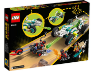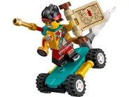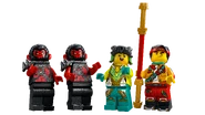 4 LEGO® toy minifigures – Mei with a Jade Dragon Blade, Monkie Kid with The Golden Staff and Cloud Board, plus map and compass elements, and Rumble and Savage with a chain hook and spiked staff
