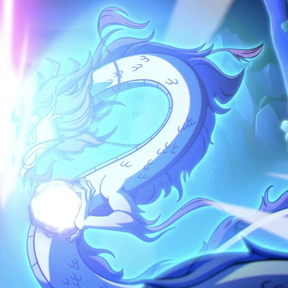 Ao Bing is a white-scaled dragon with pale blue hair.