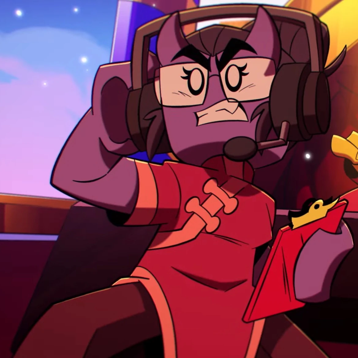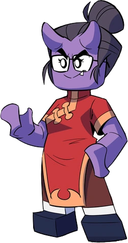 The Demon Accountant is a purple demon with mauve hair tied in a high bun. She has thick eyebrows, small purple horns, and square glasses.