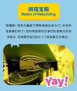 The Realm of Rebuilding is a building area where people can make their own creations with the LEGO bricks. It is based off a destroyed museum and the concept of the 40474 Build your own Monkey King. People need to help rebuild the area with their own imaginations.
