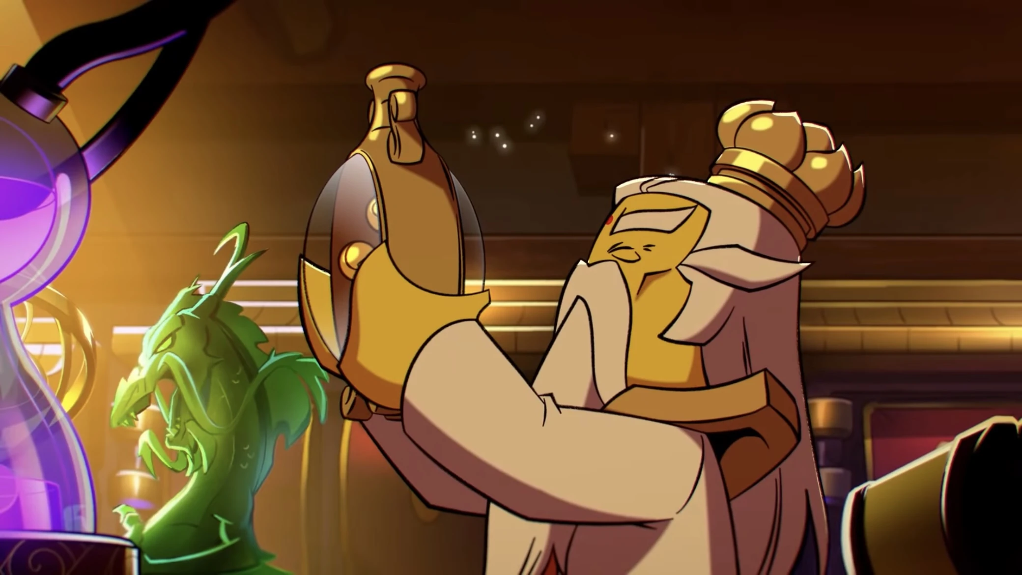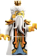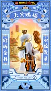 Lao Tzu dresses in a white and orange robe with black trimming and has golden-colored shoulder pads. He also wears a crown that resembles a lotus flower.