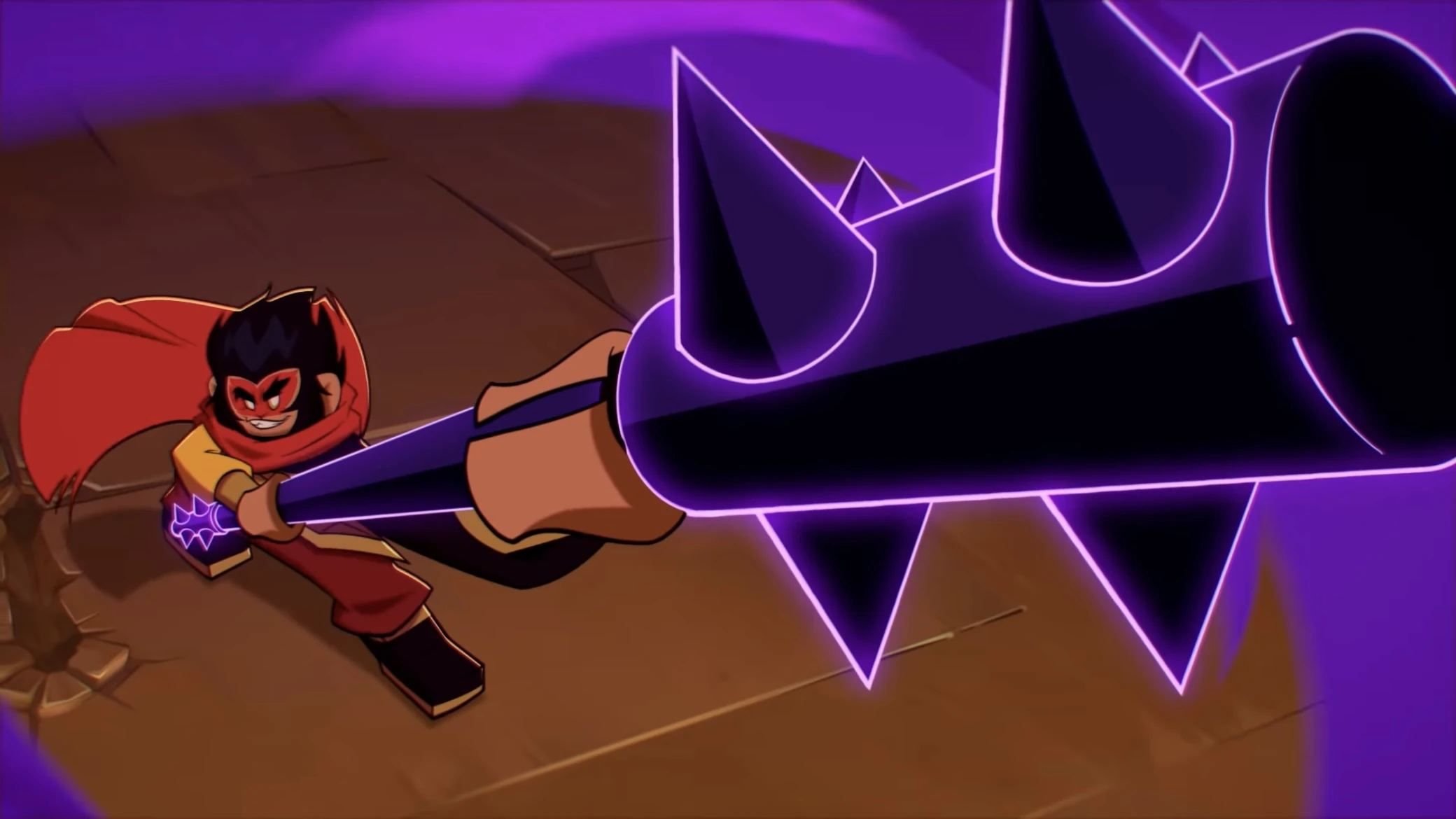 The staff is a black cudgel that glows purple. When it is struck it wavers, indicating it is made of shadows.