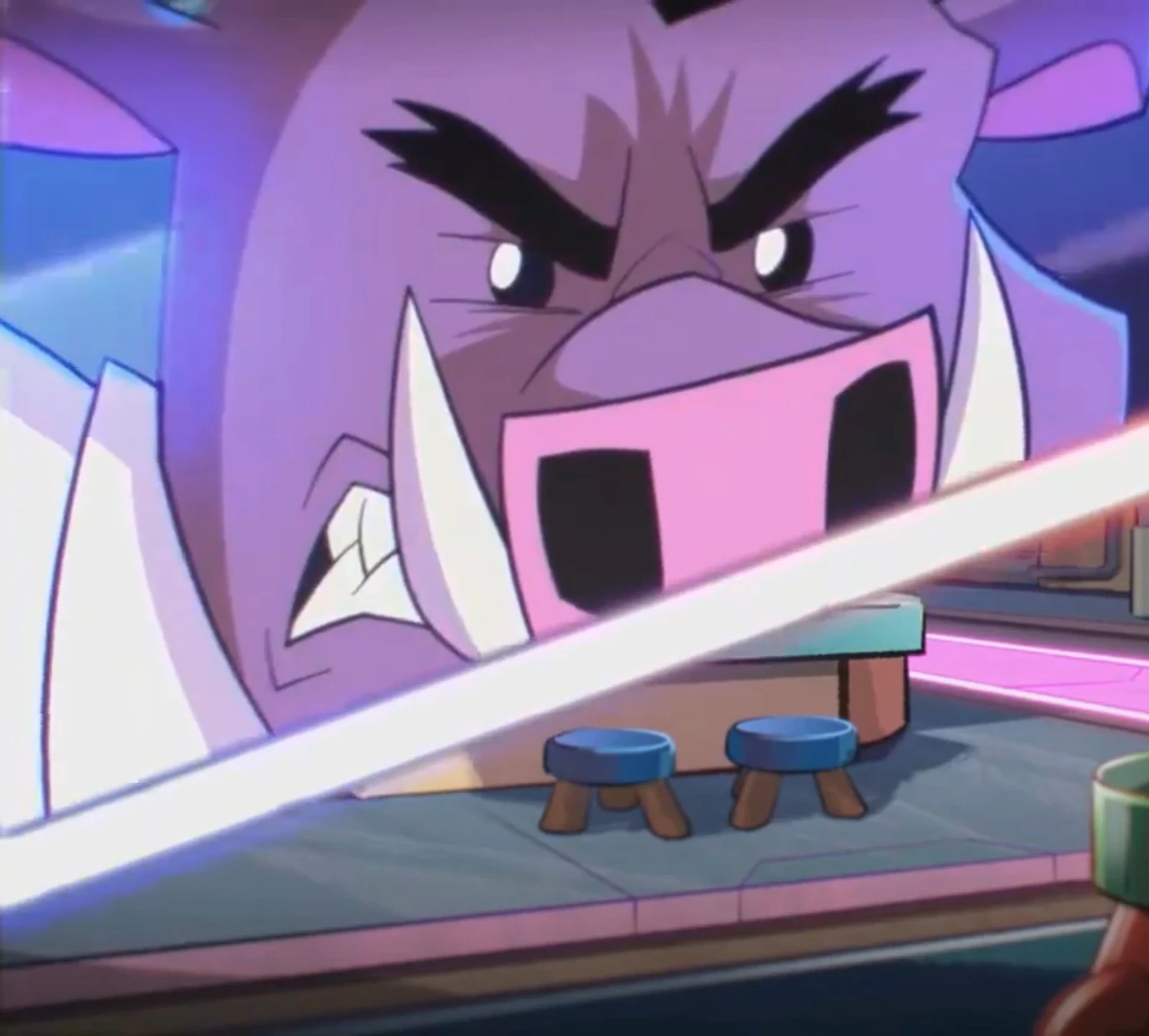 Mr. Boar is a brown anthropomorphic boar with a black mohawk and sharp tusks