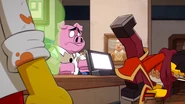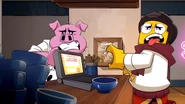 Tang took on the persona of a renowned food critic named Golden Cicada Yum Yum, creating an impression among Pigsy and MK that he was a well-known figure in the culinary world. However, the perception was far from reality. In his first review, Tang visited Pigsy's Noodles to sample their various noodle dishes. Unfortunately, Tang's experience at the restaurant was marred by MK's poor hygiene, prompting him to write a negative review. To his dismay, Pigsy discovered that Tang was the site's sole follower, leading to a surge of anger that culminated in an attack on Tang.