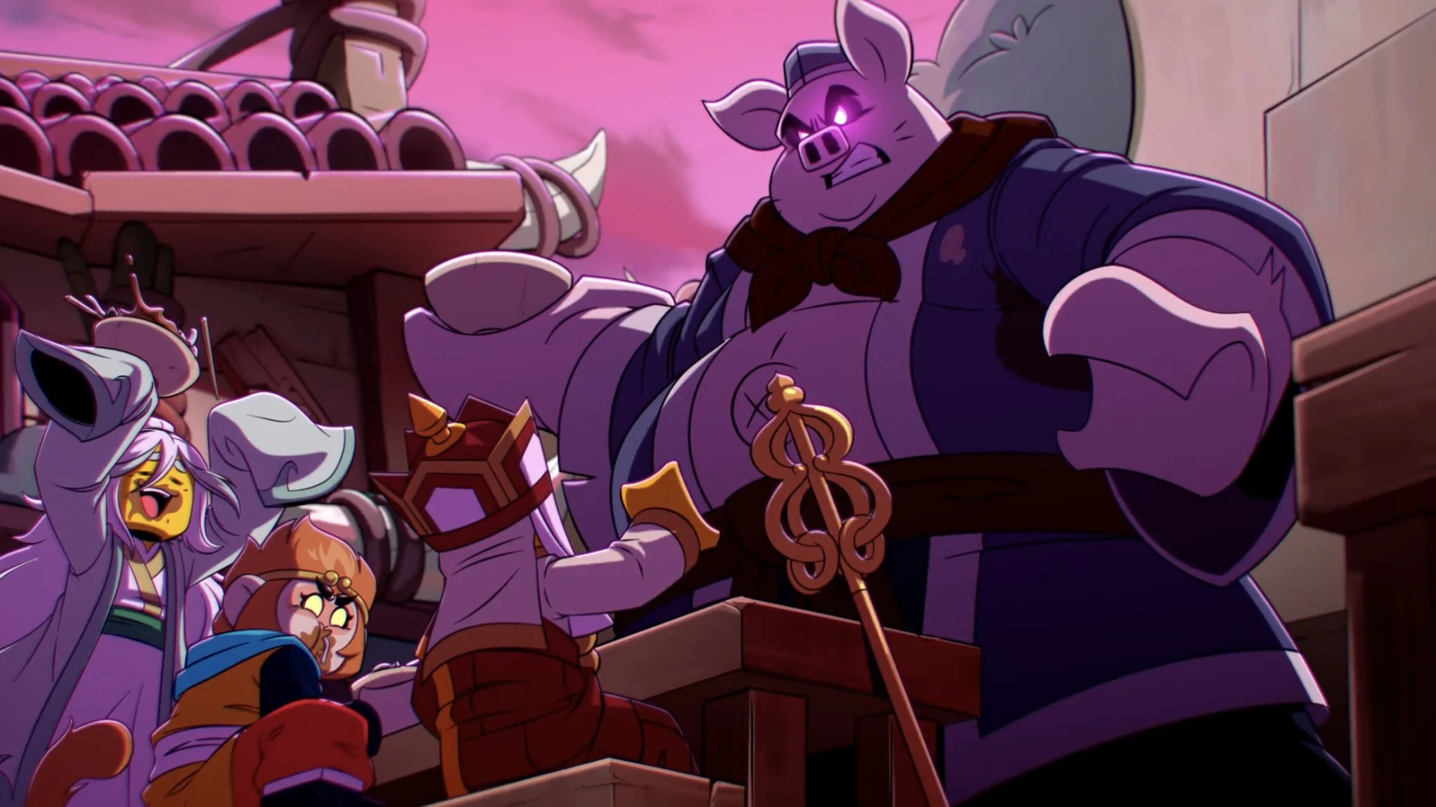 Zhu Bajie is a pale pink Pig Demon. He has short whiskers on his cheeks and head.